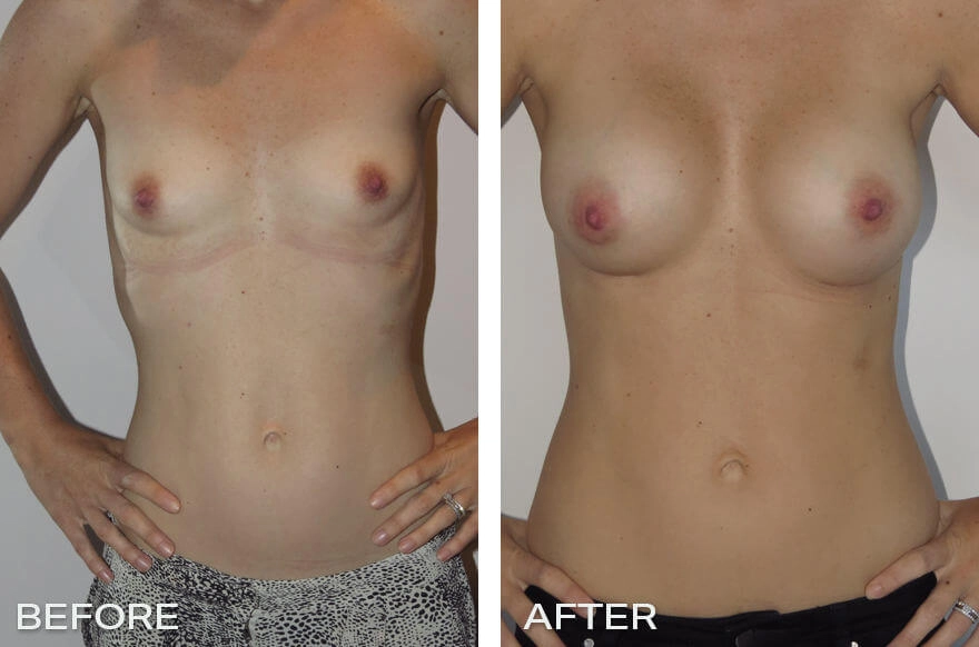 On examination, the patient was a valid candidate for a bilateral breast augmentation. During the consultation process, Dr Hunt and the patient chose to use a cohesive silicone gel anatomic or tear drop shaped implant inserted underneath the pectoralis muscle via an incision in the infra-mammary fold so as to hide the scar. Her surgery was performed as a day only procedure.